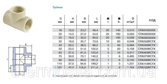 Трійник PP-RCT EKOPLASTIK. Основне призначення з’єднувальної частини – розгалудження трубопроводу однакового діаметру під прямим кутом. Може працювати на всьому діапазоні робочих температур і тиску (залежно від типу труби). Має компактні розміри. Ідеально підходить для важкодоступних місць. Використовується з пластиковими трубами WAVIN Ekoplastik усіх типів