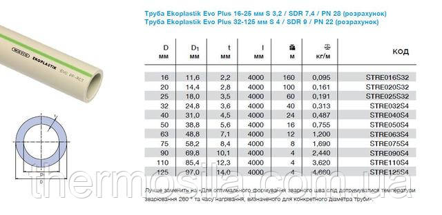 Труба EKOPLASTIK EVO - суцільнопластикова труба з поліпропілену PP-RCT (тип 4) без армування, що приходить на зміну неармованим трубам з поліпропілену PP-R (PN-10, PN-16, PN-20) та повністю сумісна з цими трубами. Ekoplastik Evo - призначена для систем холодного питного водопостачання, систем підлогового опалення, господарчої й виробничої теплої води, систем стисненого повітря й кондиціювання. Її можна використовувати для систем низькотемпературного опалення, до 70 градусів, але тільки за умови чіткого дотримання вимог інструкції з інсталяції. Зовні труби EVO сірого кольору з широкою повздовжньою полосою світло-зеленого кольору. На трубі є напис чорного кольору, що містить назву виробника, позначення труби, діаметр і товщину стінки, серію (напірний ряд), час і дату виготовлення, номер виробничої лінії.